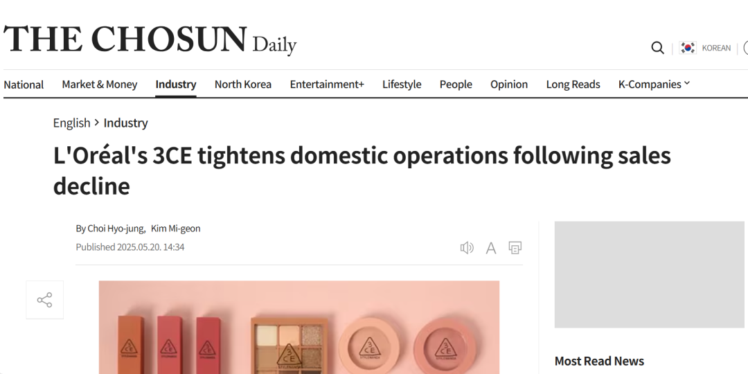 5月20日,有報(bào)道稱歐萊雅集團(tuán)收購(gòu)的品牌被曝裁員、退出。據(jù)韓媒THE CHOSUN Daily報(bào)道,韓妝3CE母公司Stylenanda近期啟動(dòng)了員工自愿離職計(jì)劃,旗下韓妝品牌3CE(全稱3CE STYLENANDA,中文名:三熹玉)也被猜測(cè)因業(yè)績(jī)長(zhǎng)期低迷退出韓國(guó)市場(chǎng)。