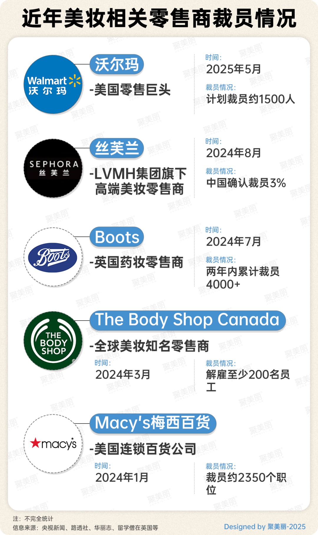 而于美妝相關(guān)的零售商而言,包含絲芙蘭、Boots、The Body Shop等也均被報道裁員,裁員原因多系削減成本,扭轉(zhuǎn)銷售放緩。