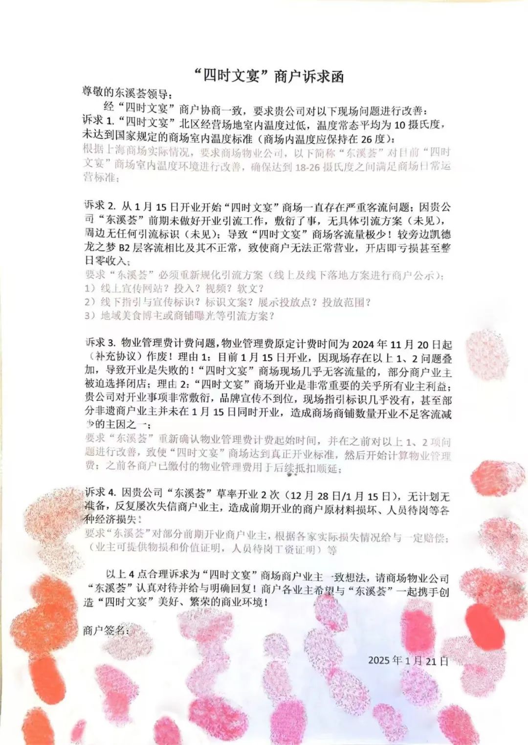 2025年1月21日,30位商戶聯(lián)名向運(yùn)營方提交訴求信,指出場地存在長期低溫、人流不足、異味較重及物業(yè)服務(wù)缺位等問題,要求改善供暖、加強(qiáng)引流,并就經(jīng)營損失提出補(bǔ)償請求。