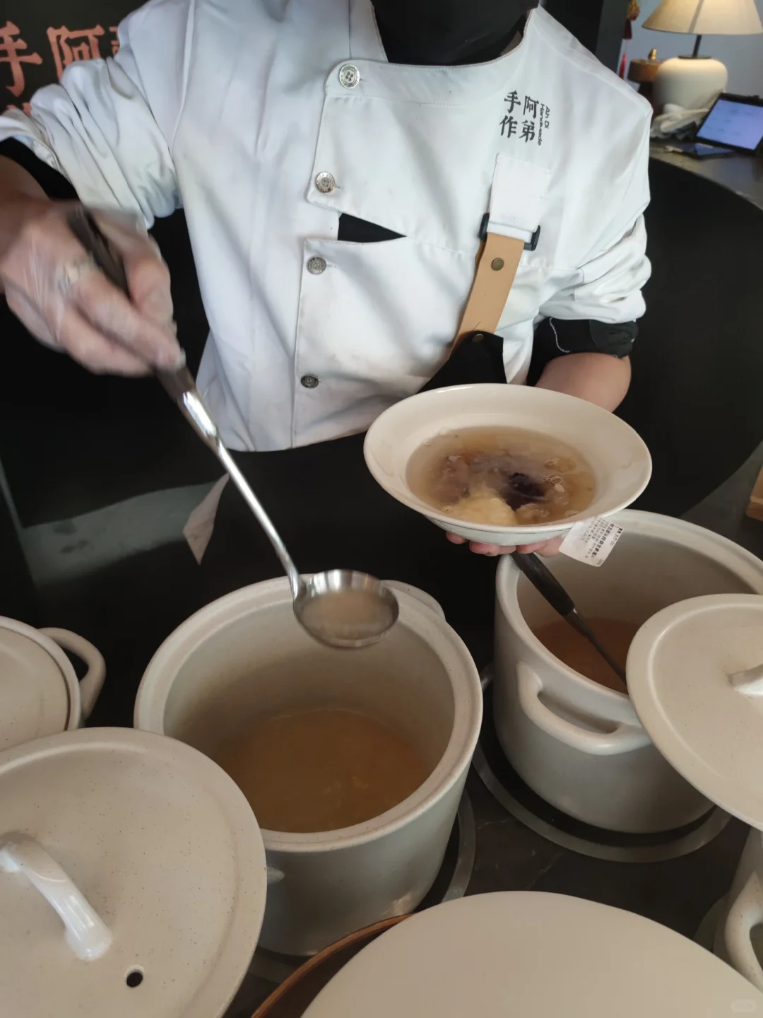 為了體現(xiàn)手作特色,像玲瓏入水、阿弟仔等店鋪不僅直接把“手作糖水”的字樣刻在招牌上,有些甚至直接將后廚搬至前廳,在消費(fèi)者面前現(xiàn)場制作產(chǎn)品。比如在RUXU入續(xù)店內(nèi),雖然門店因售賣面包類產(chǎn)品占據(jù)了部分面積,但仍在前廳設(shè)置了操作臺,顧客可以通過它看到產(chǎn)品熬制以及配料的全過程。