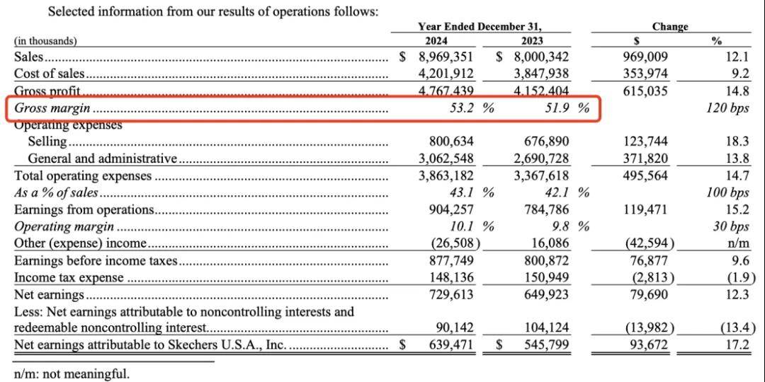 斯凱奇的毛利率也高于同行,其2024年毛利率達(dá)到53.2%,高于耐克(44.7%)和阿迪達(dá)斯(50.8%),這主要得益于品牌在產(chǎn)品結(jié)構(gòu)、渠道和供應(yīng)鏈效率上的管控。
