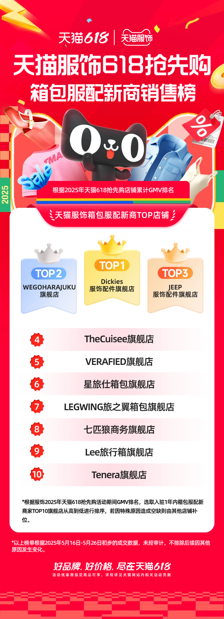 在男女鞋、手表眼鏡、箱包服配等其他細(xì)分類目,也涌現(xiàn)出了WeFlower、fila眼鏡、Dickies服飾配件等新商拿下類目TOP1。