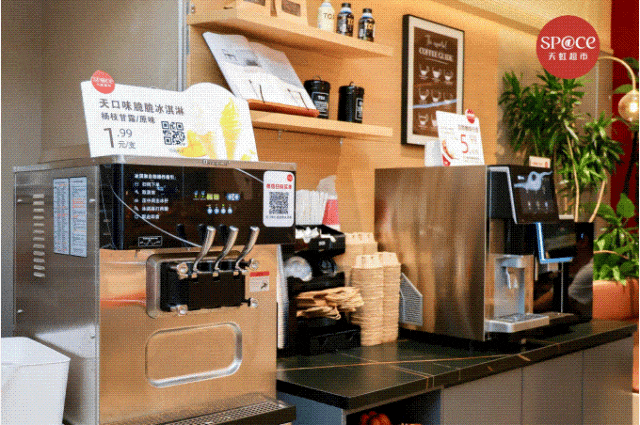 在入口處,sp@ce3.0特意辟出了一方天地,讓用戶除了效率購(gòu)物,還能放松地慢下來(lái),享受生活的美好,5.9元一杯的咖啡,原料卻是進(jìn)口的阿拉比卡咖啡豆+新西蘭牛奶,1.99元的冰激凌,卻是經(jīng)天虹采購(gòu)人員十幾種配方篩選后的用心之作。