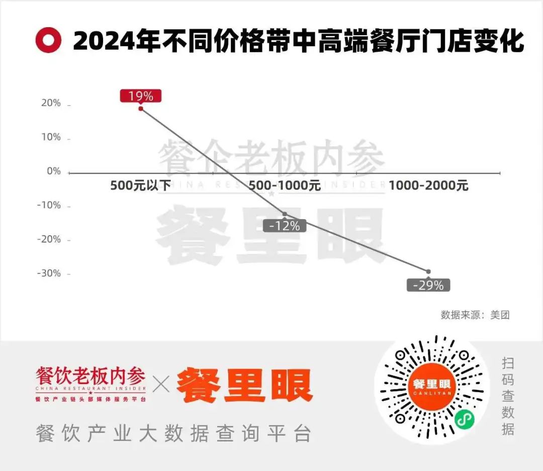 美團數(shù)據(jù)顯示,2024年,許多千元檔位的餐廳正在向500元檔位轉(zhuǎn)型。具體來看,全國中高端餐飲門店數(shù)變化如下,500元以下檔位的餐廳環(huán)比增長19%,500-1000元檔位和1000元-2000元檔位均環(huán)比減少12%,2000元以上檔位的餐廳減少29%。
