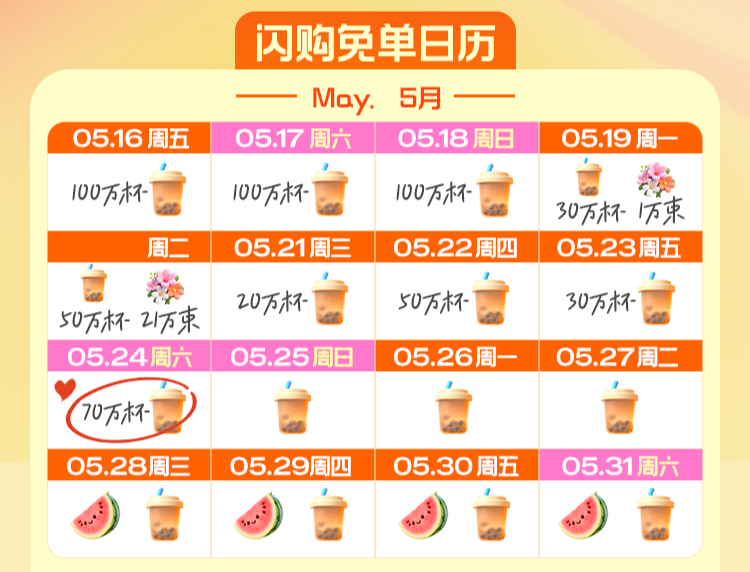 5月24日,淘寶閃購(gòu)下單會(huì)隨即收到在淘寶秒殺頻道限時(shí)可用的驚喜紅包;5月16日和24日又分別送出了100萬和70萬杯奶茶。