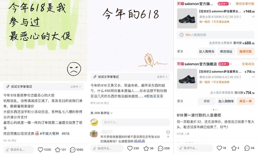 與此同時(shí),“618第一波付款的人傻了吧”、“越早買東西的越虧”、“為何預(yù)售比現(xiàn)貨還貴”、“對(duì)618絕望了,不斷漲價(jià)降價(jià)”……消費(fèi)者的不滿聲音同樣一陣陣掀起。