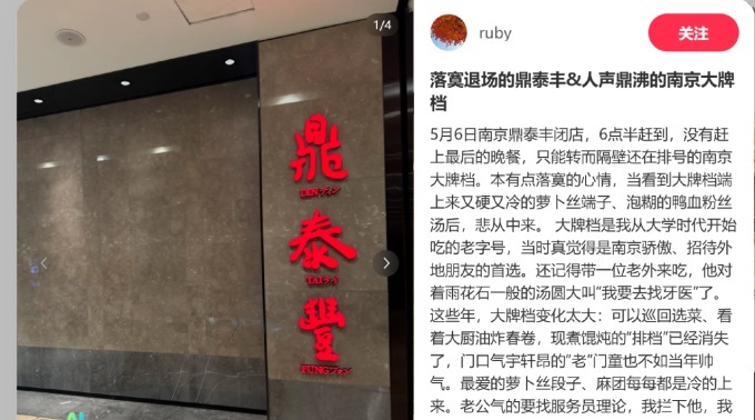 值得注意的是,今年鼎泰豐悄然關(guān)閉的不僅是寧波門店。南京的小紅書網(wǎng)友發(fā)布《落寞退場的鼎泰豐》帖子稱:“5月6日18:30前往德基一期7樓鼎泰豐,發(fā)現(xiàn)已閉店,沒趕上最后一頓,心情很失落。”