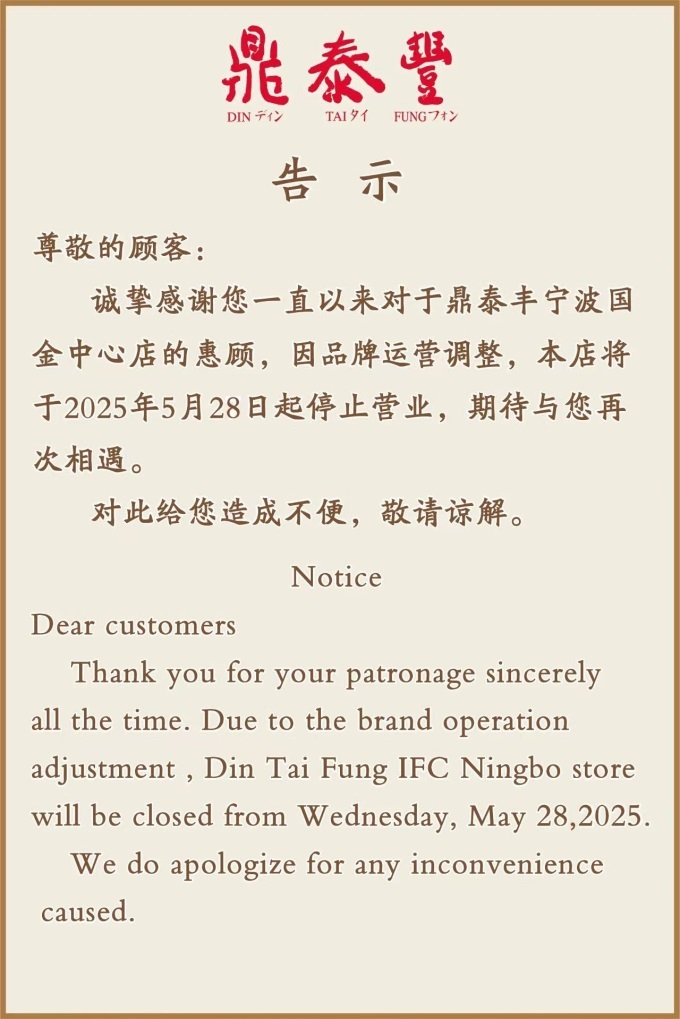 近期,有媒體發(fā)現(xiàn)鼎泰豐寧波國金中心店因品牌運營調(diào)整停止運營。作為鼎泰豐在寧波的唯一門店,其門頭上已粘貼告知:“因品牌運營調(diào)整,本店將于2025年5月28日起停止營業(yè)。期待與您再次相遇。”此前,寧波江北萬象城門店已關(guān)閉,國金中心門店的停業(yè)意味著鼎泰豐正式退出寧波市場。