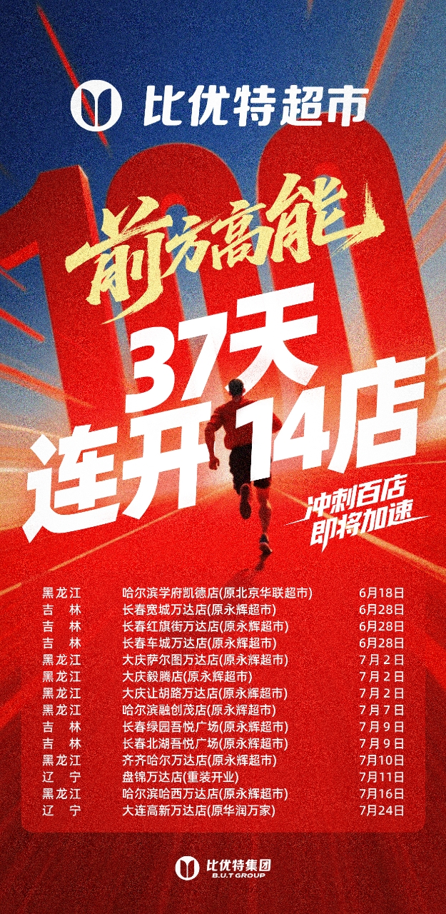 據(jù)了解,截止目前比優(yōu)特超市在東北三省擁有連鎖門店82家。而從今年“618”開始,比優(yōu)特超市將在接下來的37天內(nèi)集中連開14家新店,平均不到3天就有一家新店亮相開業(yè)。其中包括對原有的比優(yōu)特超市盤錦萬達店的重裝升級。