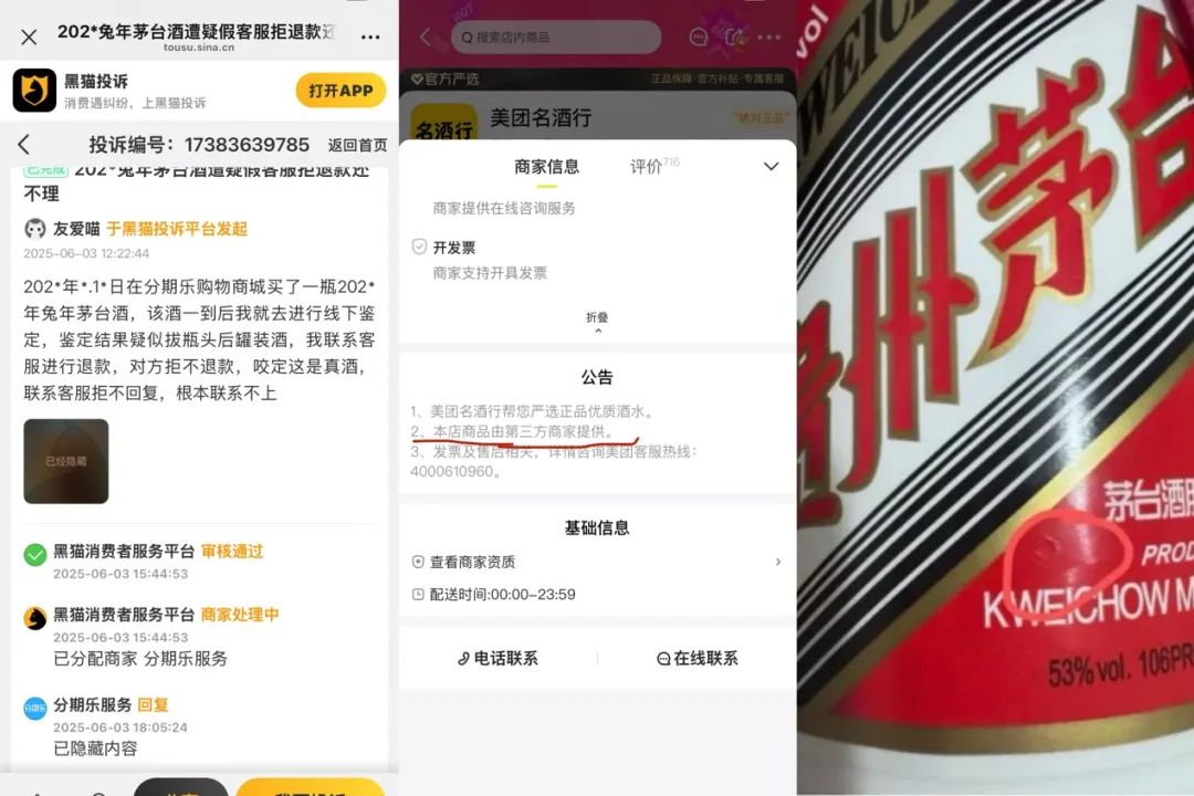 還有部分消費(fèi)者收到假貨和瑕疵品。也就是,實(shí)際收貨產(chǎn)品出現(xiàn)防偽碼磨損、包裝破裂、酒瓶瑕疵的情況,往往是拔頭酒、舊瓶裝假酒的打孔酒。
