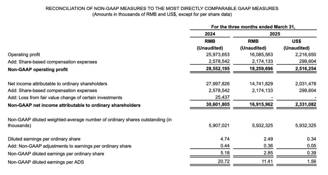 據(jù)財報顯示,2025年第一季度,拼多多總收入為956.722億元,同比增長10%,連續(xù)第二個季度營收同比增幅低于20%;營業(yè)利潤為160.856億元,同比下降38%;非美國通用會計準則下營業(yè)利潤為182.597億元,同比下降36%。