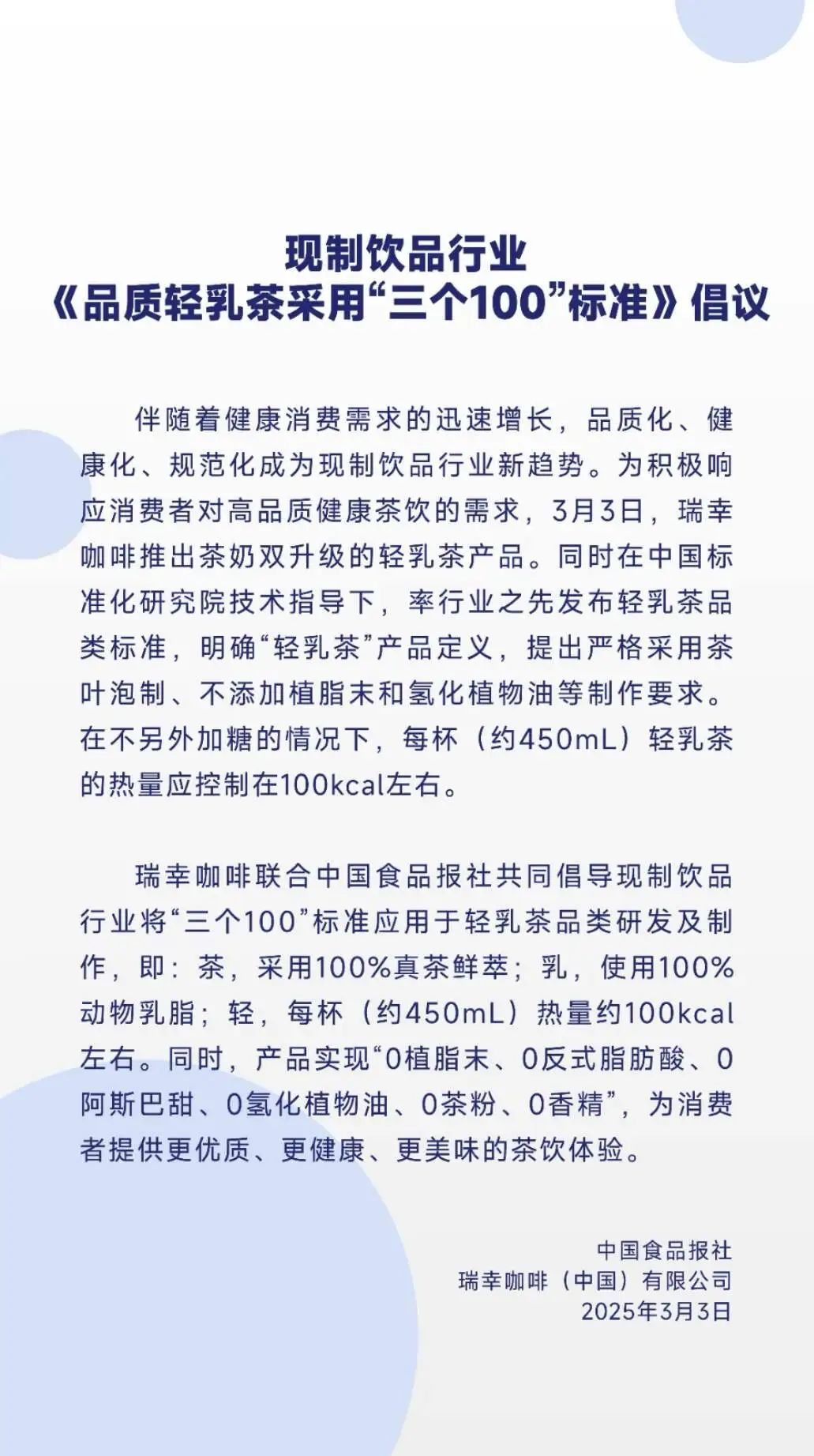 在輕乳茶風(fēng)靡市場,但標準尚未清晰的時間點,瑞幸率先提出“三個100”輕乳茶標準,不僅加強了用戶對瑞幸輕乳茶的健康認知,也是對行業(yè)規(guī)范化的一次推動。