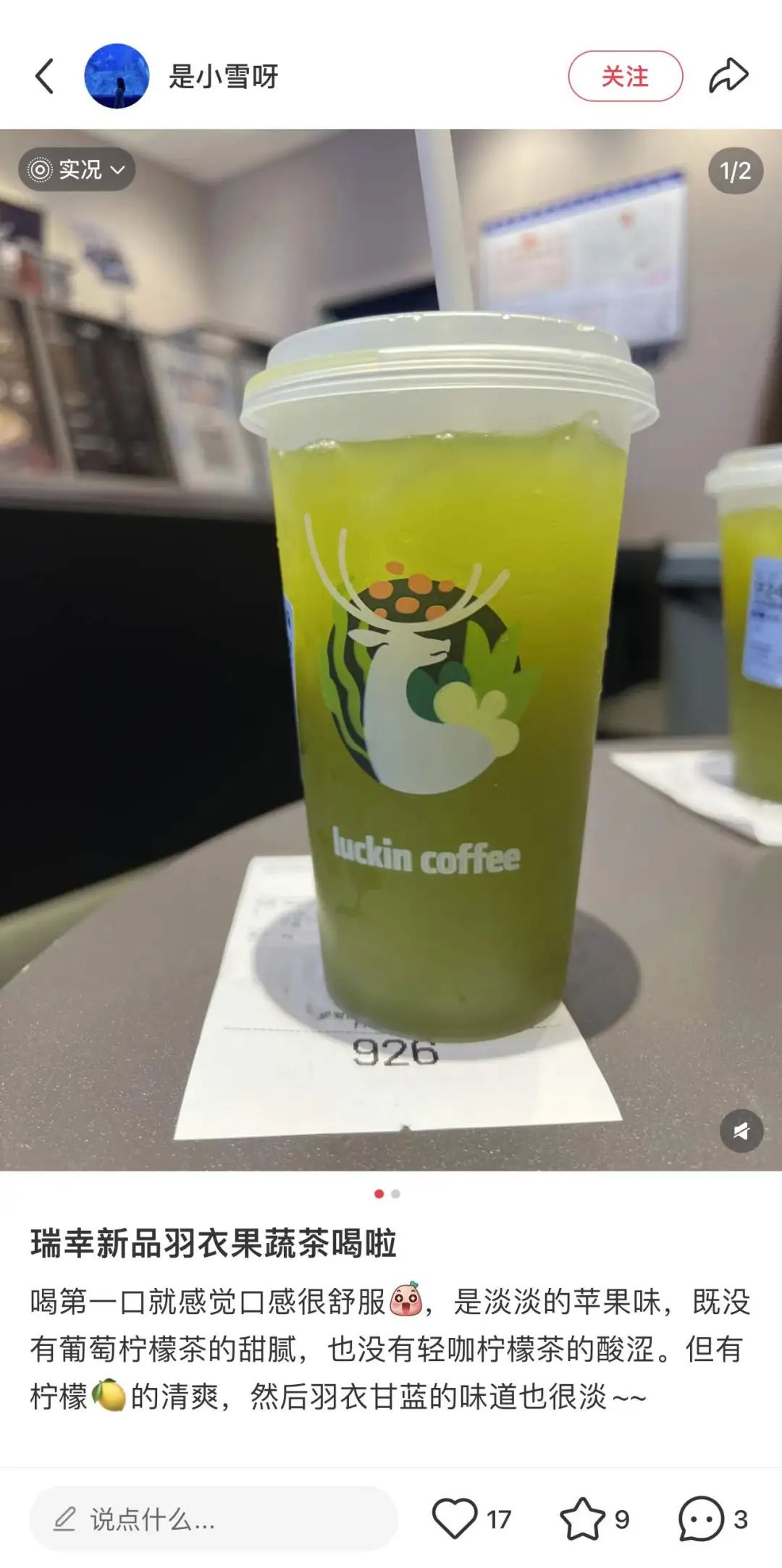 5月31日,瑞幸推出羽衣輕體果蔬茶。6月9日再次上新椰子水,兩款產(chǎn)品均為瑞幸首次上線。