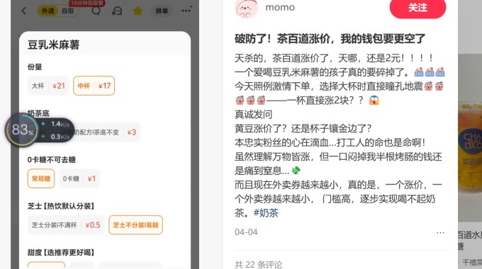 此外,不少網(wǎng)友也發(fā)現(xiàn)茶百道悄然漲價:小紅書博主@momo發(fā)帖吐槽“愛喝的豆乳米麻薯突然漲了2塊,外賣優(yōu)惠也縮水,杯子是鑲金邊了嗎?我的錢包要更空了”;網(wǎng)友@小紅薯61FF2C7C也指出“團購最初兩杯都是9.9元,現(xiàn)在一杯9.9元、一杯12.9元”。