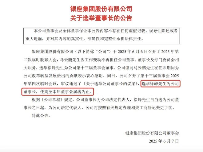 6月7日,銀座集團股份有限公司發(fā)布的董事長更迭公告,宣布因馬云鵬先生工作變動,其不再擔(dān)任公司董事、董事長及專門委員會相關(guān)職務(wù)。