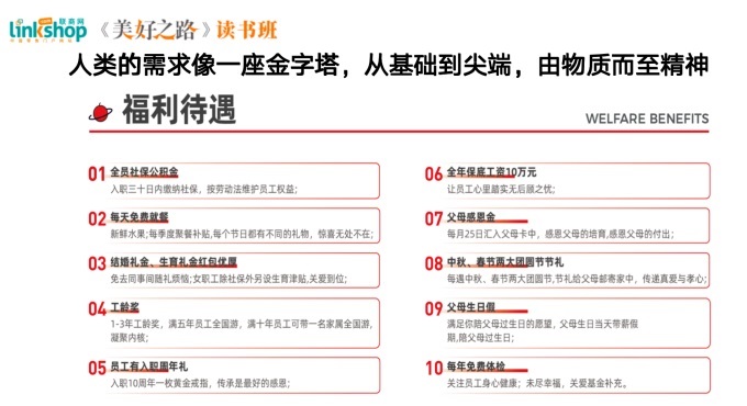第三個標(biāo)簽,沒有不學(xué)習(xí)的員工。從我做起,我每天有三個小時的時間讀書。我沒有應(yīng)酬,時間很充裕。我不想把員工當(dāng)牛馬,我希望他們在這成長。萬物之中,成長最美,最好的成長是培養(yǎng)健全的人格。怎么培養(yǎng)健全的人格,怎么成就陽光個性的生命呢?書里面人類的思想。我認(rèn)為成就一個人比創(chuàng)造財富更重要。