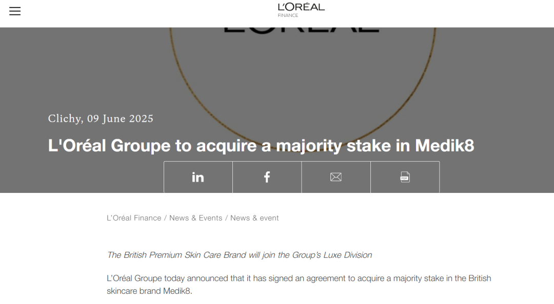 信息來源:歐萊雅集團官方公告、WWD、Medik8官方微信公眾號