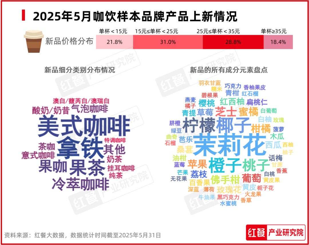 2025年5月,紅餐產(chǎn)業(yè)研究院監(jiān)測(cè)到有22個(gè)咖飲品牌共推出了108款新品。從咖飲品類(lèi)來(lái)看,美式咖啡、拿鐵、冷萃咖啡的新品數(shù)較多,果咖、茶咖、氣泡咖啡等新品數(shù)亦有一定占比。此外,咖飲品牌推出的茶飲類(lèi)新品也較多,如果茶、奶茶、酸奶/奶昔等。