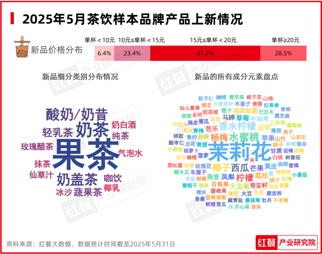 從價(jià)格分布來(lái)看,5月茶飲品牌的新品價(jià)格整體小幅上漲,主要集中在15元≤單杯<20元和單杯≥20元兩個(gè)區(qū)間內(nèi),占比分別為41.7%和28.5%,而10元以下和10元≤單杯<15元的茶飲新品則相對(duì)較少,占比分別為6.4%和23.4%。