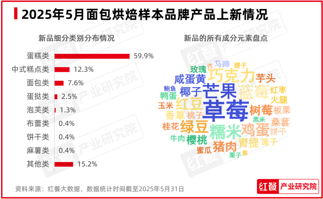 2025年5月,在紅餐產(chǎn)業(yè)研究院監(jiān)測(cè)的面包烘焙品牌中,有33個(gè)面包烘焙品牌共推出了237款新品。
