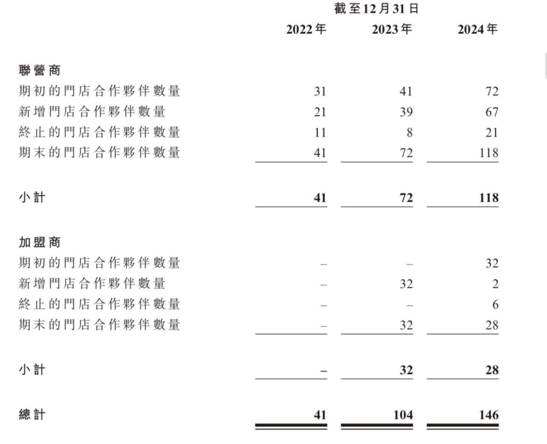 從經(jīng)營風(fēng)險角度看,合作門店的不穩(wěn)定性也不容忽視。2022年至2024年,林清軒分別有11家、8家和21家聯(lián)營商終止合作;加盟商方面,2024年也有6家合作方退出,加盟商總數(shù)從期初的32家降至28家,出現(xiàn)負(fù)增長。聯(lián)營店關(guān)店率為23.48%,加盟店更高,達(dá)28.1%。