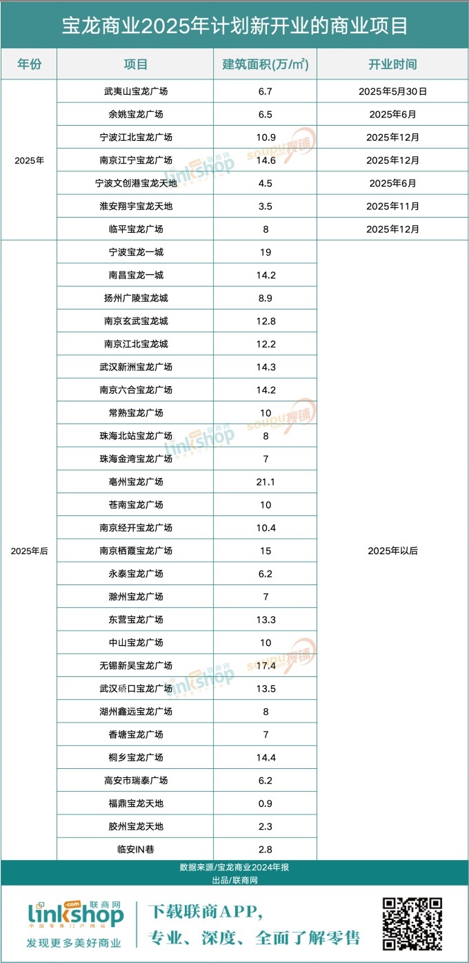 2025年,武夷山寶龍廣場(chǎng)(5月30日已開業(yè))、余姚寶龍廣場(chǎng)、寧波江北寶龍廣場(chǎng)、南京江寧寶龍廣場(chǎng)、寧波文創(chuàng)港寶龍?zhí)斓、淮安翔宇寶龍(zhí)斓、臨平寶龍廣場(chǎng)7座商業(yè)體將開業(yè)。