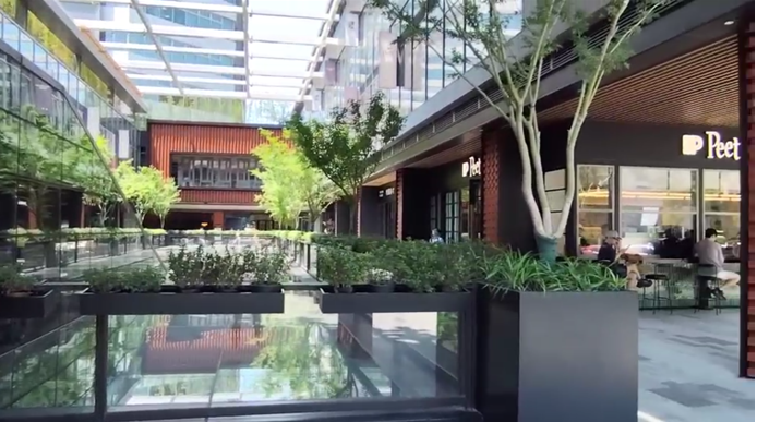 筆者看到了另外一個新開業(yè)的商場,距今開業(yè)約半年時(shí)間。商場體量不大,是一個小盒子+街區(qū)的構(gòu)成,自帶一個辦公樓,與前面例子中的商業(yè)格局類同。