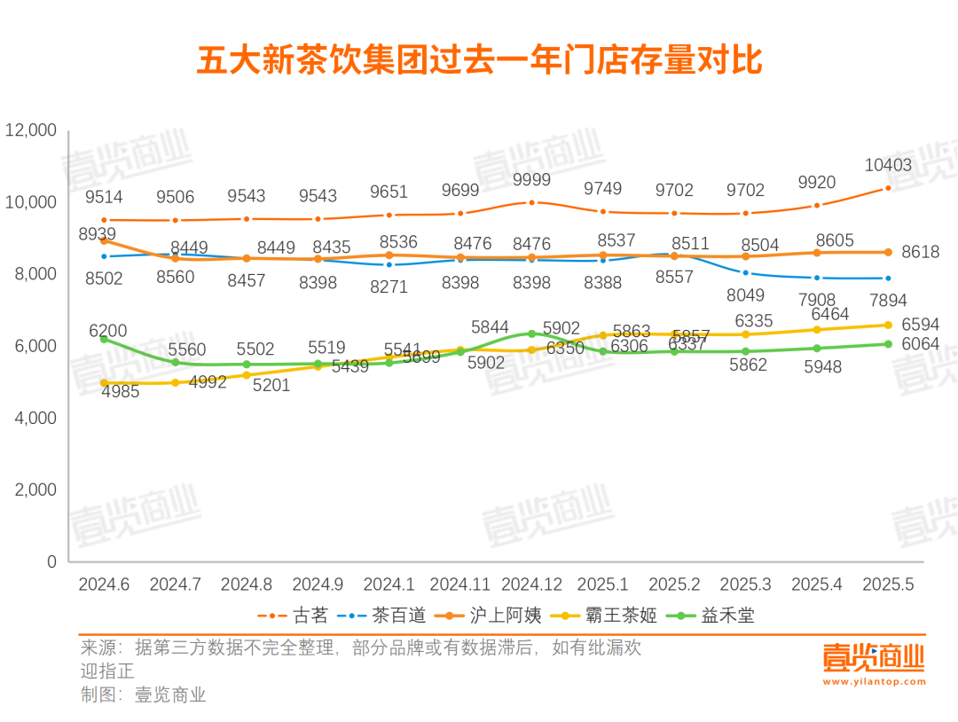 進(jìn)入2025年5月,新茶飲頭部五大品牌的門(mén)店擴(kuò)張呈現(xiàn)出更加分化的格局。長(zhǎng)期穩(wěn)居“第二梯隊(duì)之首”的古茗,終于在本月邁入“萬(wàn)店俱樂(lè)部”,現(xiàn)存門(mén)店數(shù)達(dá)10403家。
