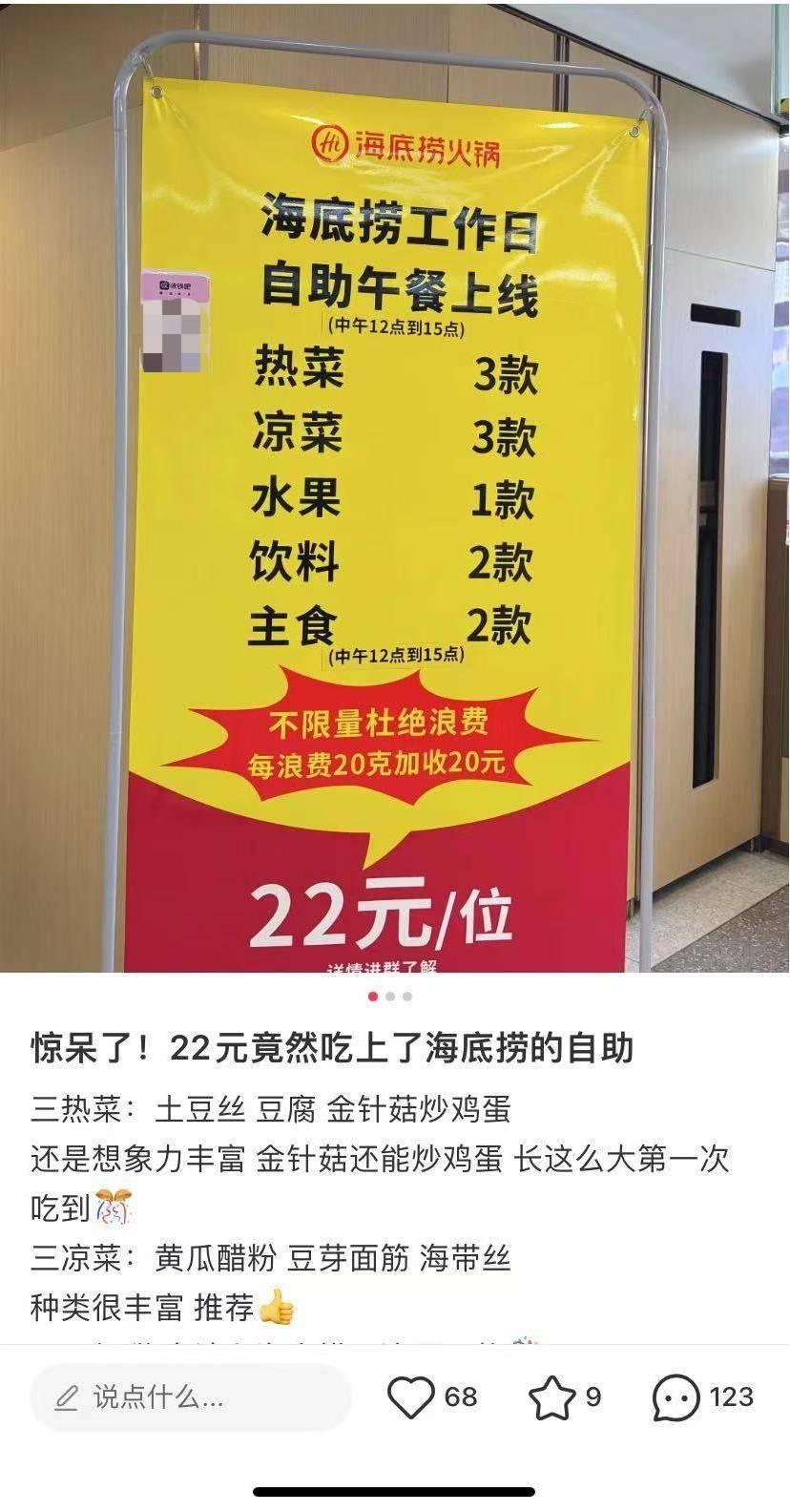 據(jù)一陜西網(wǎng)友發(fā)布的帖子,海底撈一門店上線了工作日自助午餐,22元一位,包括3款熱菜,3款涼菜,1款水果,2款飲料和2款主食,僅限中午12點到15點。