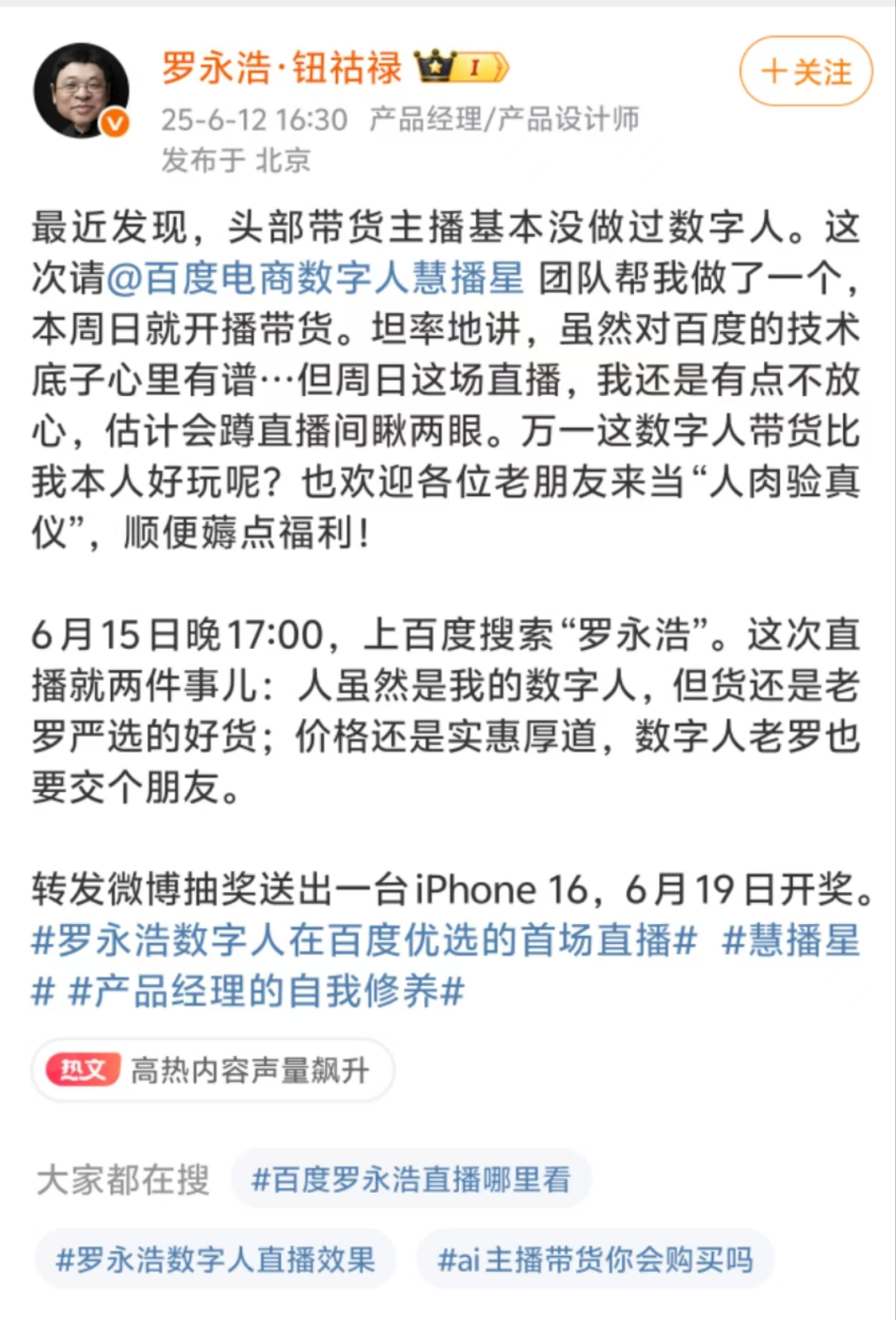 據(jù)了解,6月12日羅永浩發(fā)文稱自己將嘗試數(shù)字人直播,其數(shù)字人在百度優(yōu)選的首場直播定于2025年6月15日17時開啟。