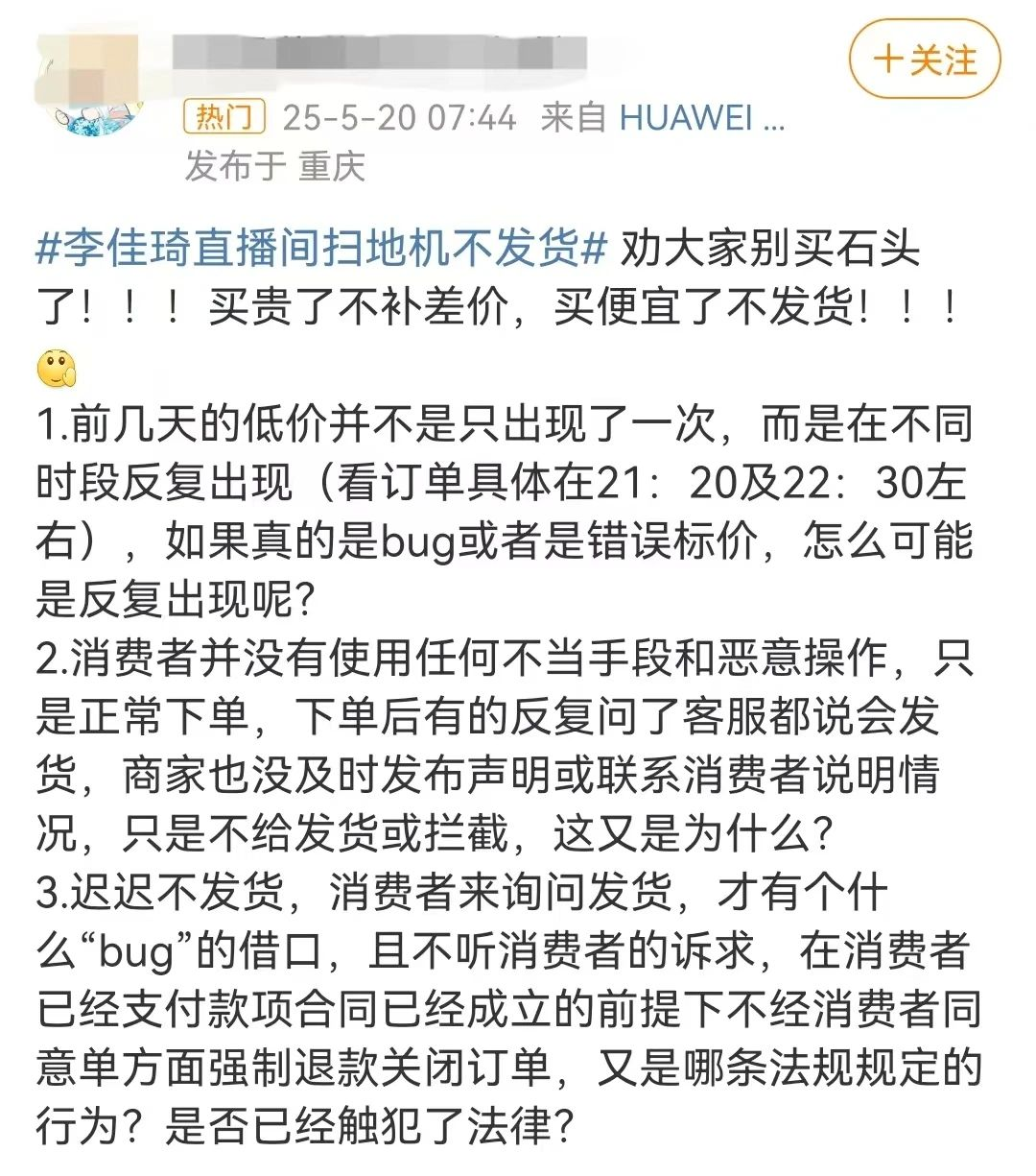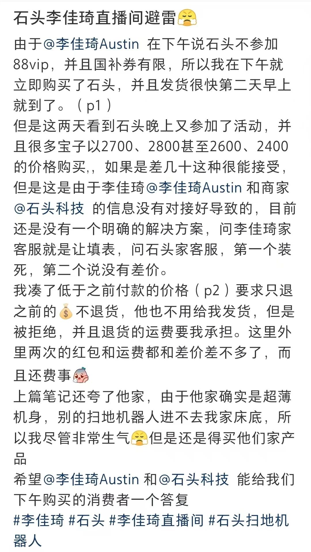 李佳琦直播間賣低價掃地機(jī)器人不發(fā)貨 圖源:小紅書