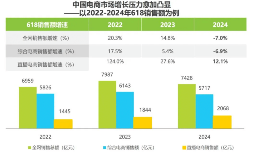 星圖數(shù)據(jù)顯示,2024年618總銷售額同比下滑7%,是16年來首次負增長;直播電商增速雖然還有12%,但相比前兩年124%、27.6%的高增長明顯放緩,超頭主播挖掘增量的難度也在加大。