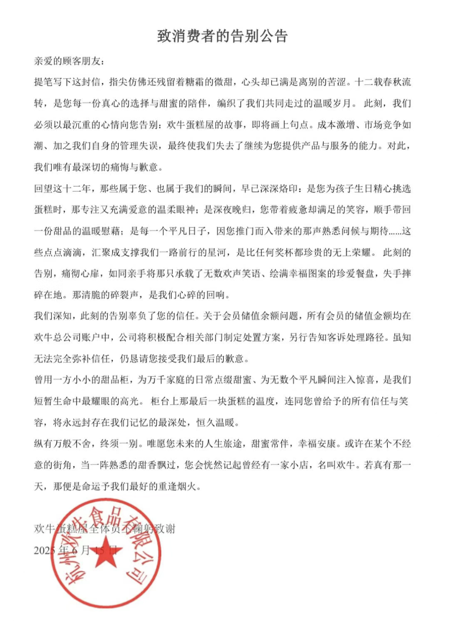 6月15日,歡牛蛋糕屋發(fā)布“致消費(fèi)者的告別公告”稱(chēng),成本激增、市場(chǎng)競(jìng)爭(zhēng)如潮、加之自身的管理失誤,最終使企業(yè)失去了繼續(xù)為顧客提供產(chǎn)品與服務(wù)的能力。