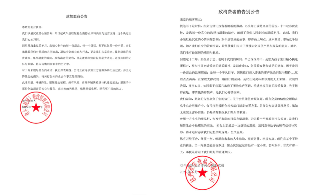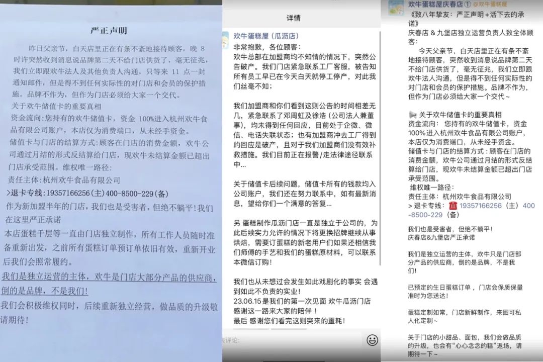 而對于會員儲值和加盟合約,歡牛蛋糕屋給出的方案均是“另行告知處理路徑”。但絕大多數(shù)的消費者對預(yù)付款的退還并不抱希望。