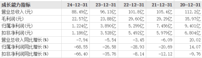 2024年,公司實(shí)現(xiàn)營收88.49億,同比下滑7.94%;歸母凈利潤1.224億,同比下滑68.55%;扣非凈利潤1.186億,同比下滑66.40%。