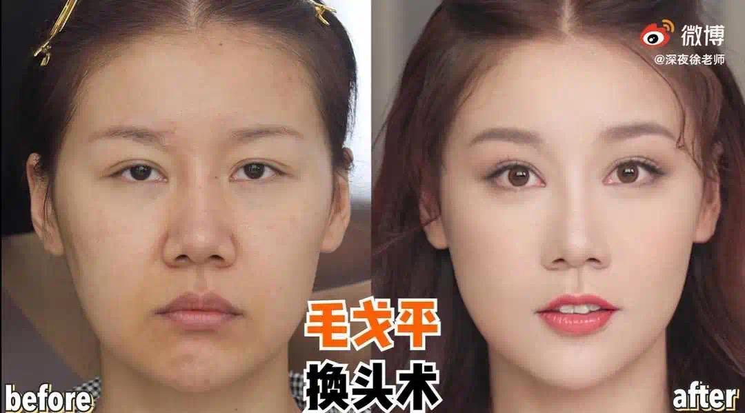 上圖為深夜徐老師,下圖為毛戈平給李佳琦助播Seeya化的“劉亦菲仿妝”