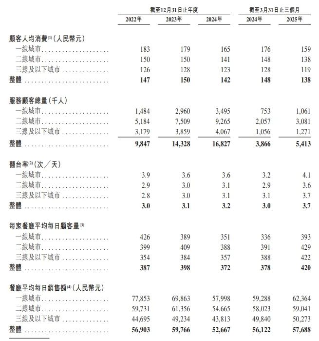 招股書顯示,巴奴的客單價(jià)從2022年的147元降到2024年的142元。從季度的數(shù)據(jù)來(lái)看,2024年第一季度的客單價(jià)為148元,這一數(shù)據(jù)在2025年的第一季度降為138元。