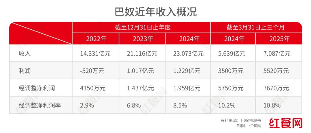 根據(jù)招股書,2024年巴奴的收入約23.07億元,利潤(rùn)為約1.23億元,經(jīng)調(diào)利潤(rùn)約1.96億元。2025年一季度(截至3月31日),上述數(shù)據(jù)分別為約7.09億元、5520萬(wàn)元、7670萬(wàn)元。根據(jù)弗若斯特沙利文的資料,巴奴是中國(guó)品質(zhì)火鍋市場(chǎng)中按收入計(jì)算的最大火鍋品牌,2024年占據(jù)了3.1%的中國(guó)品質(zhì)火鍋市場(chǎng)份額。