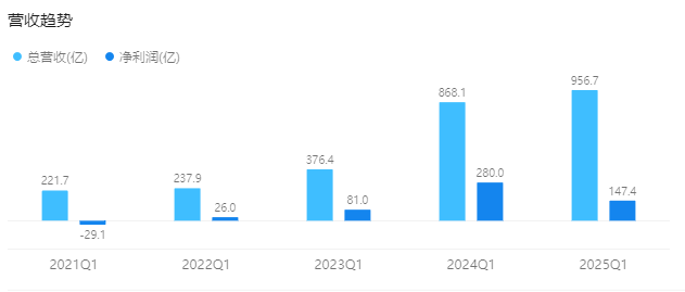拼多多2025年第一季度財報顯示,平臺總營收達到956.7億元,同比增長10%;但凈利潤卻大幅下降47%,僅為147.4億元。