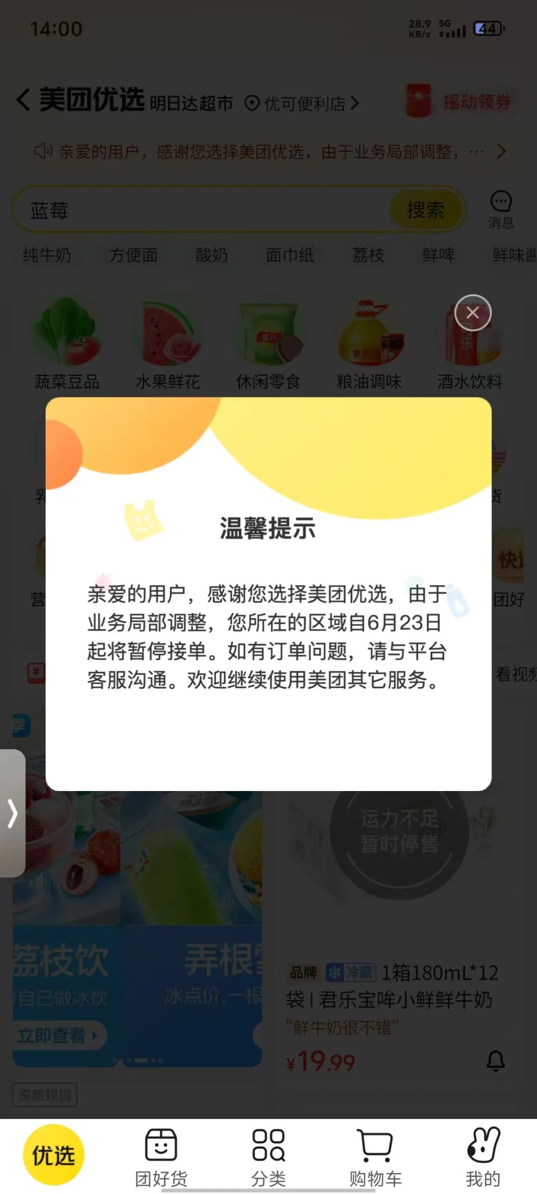 6月23日,美團優(yōu)選全國業(yè)務(wù)線關(guān)停的消息不脛而走。當(dāng)天,多位網(wǎng)友發(fā)現(xiàn),美團優(yōu)選App上商品均顯示“由于業(yè)務(wù)局部調(diào)整,您所在的區(qū)域自6月23日起將暫停接單”。