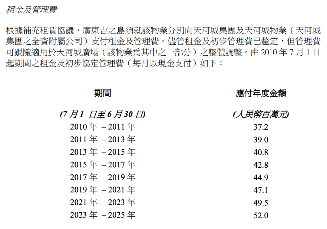 根據(jù)公告,永旺與天河城在2010年簽訂的補充租賃協(xié)議,涉及的租賃的物業(yè)為廣州市天河路208號天河城廣場負(fù)一層,而租金和管理費也自2010-2011年度的3720萬元逐步提升,至2023-2025年度的5200萬元。
