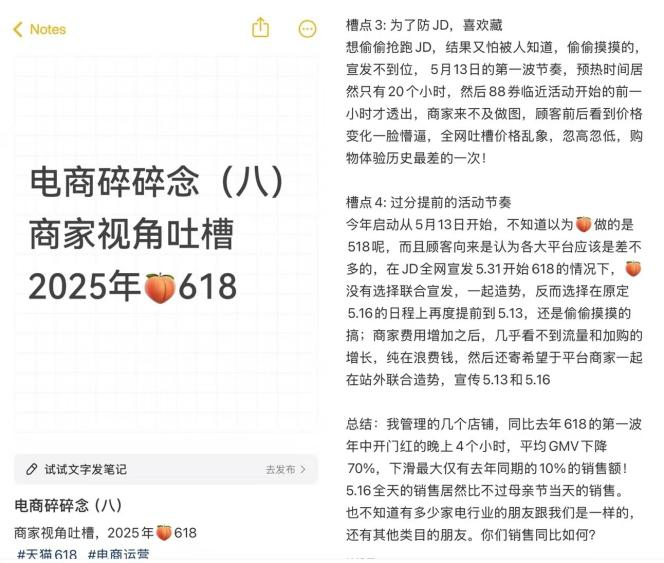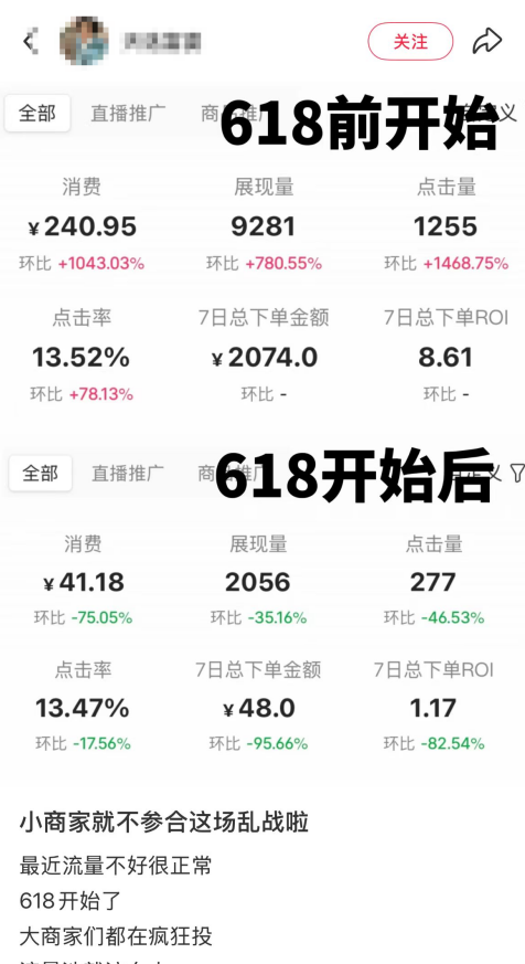 還有商家吐槽今年618開始的時(shí)間過分提前,以及宣發(fā)不到位導(dǎo)致全網(wǎng)吐槽價(jià)格忽高忽低的亂象。最后總結(jié)他管理的幾個(gè)店鋪比起去年618同比GMV下降70%,最低時(shí)僅有去年10%的銷售額。