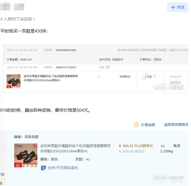 還有更離譜的,平時(shí)買鞋430,618買鞋加上各種優(yōu)惠券促銷最終價(jià)格504,硬生生貴了74元。購物節(jié)“狂歡大促”,價(jià)格比平時(shí)買還貴,就說離譜不離譜?