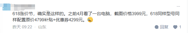 原因有很多,有人說這是因?yàn)樯唐贰跋葷q后降”,618購物節(jié)變成了618漲價(jià)節(jié)。4月3999的電腦到了618標(biāo)價(jià)卻要4799,漲價(jià)800元。