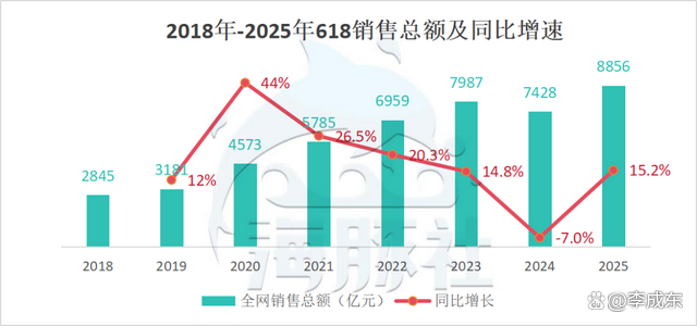 而今年618的總銷售額雖然達(dá)到了8856億,同比增長15.2%,看似有了回升。實(shí)際上全靠延長時(shí)長的老套路,疊加國補(bǔ)的大力支持。比起去年,2025年的618提前一周開始,總活動(dòng)時(shí)間又延長了7天。