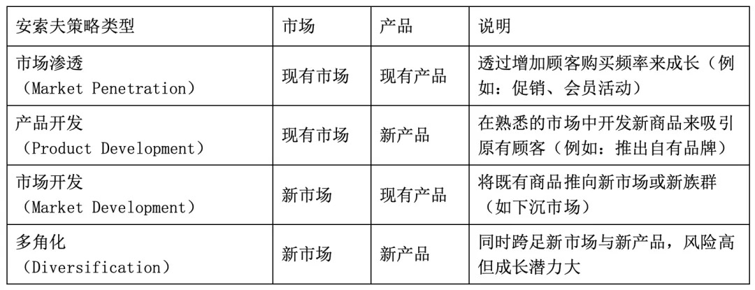·安索夫矩陣:從成長策略切入,重點(diǎn)分析品牌現(xiàn)在主力商品,是在既有市場中賣熟品(市場滲透),還是導(dǎo)入新產(chǎn)品給熟客(產(chǎn)品開發(fā))?比如,針對咖啡等下滑品類,可通過“新產(chǎn)品開發(fā)”或“新場景營銷”刺激消費(fèi),而非直接撤架。