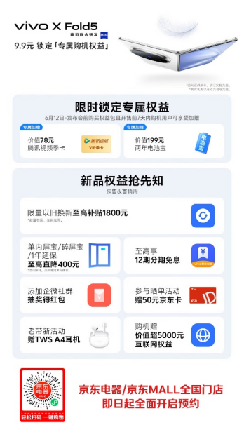 vivo X Fold5將于7月2日現(xiàn)貨開售,京東MALL、京東電器全國線下門店樣機(jī)已到店體驗(yàn),同步開啟新機(jī)預(yù)約,首發(fā)購機(jī)享以舊換新至高補(bǔ)貼1800元等7大權(quán)益。