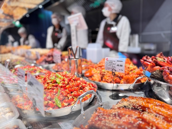 熟食面點(diǎn)區(qū)香氣四溢,東來同款豬蹄、小甜腸、炸雞等爆款,與半開放式廚房現(xiàn)場制作的土家鮮肉餅、關(guān)東煮、披薩、撈汁海鮮相映成趣,成為吸睛又吸客的熱門區(qū)域。
