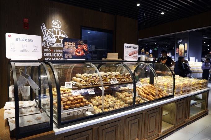 走進(jìn)調(diào)改后的賣場,現(xiàn)烤面包的香氣便縈繞鼻尖。透明操作間內(nèi),師傅正將面包坯送進(jìn)烤箱,一旁的明星產(chǎn)品“豐收的喜悅之菌菇多多”堆成小山,肉眼可見的真實菌菇粒與馬蘇里拉干酪粉交融,咸香撲鼻;榴蓮千層、瑞士卷等經(jīng)典甜點旁,更陳列著與胖東來同款的DL芋泥雪貝、焦糖可頌蛋撻,烘焙區(qū)以“不隔夜”的健康標(biāo)簽,成為昆明家庭下午茶的新選擇。