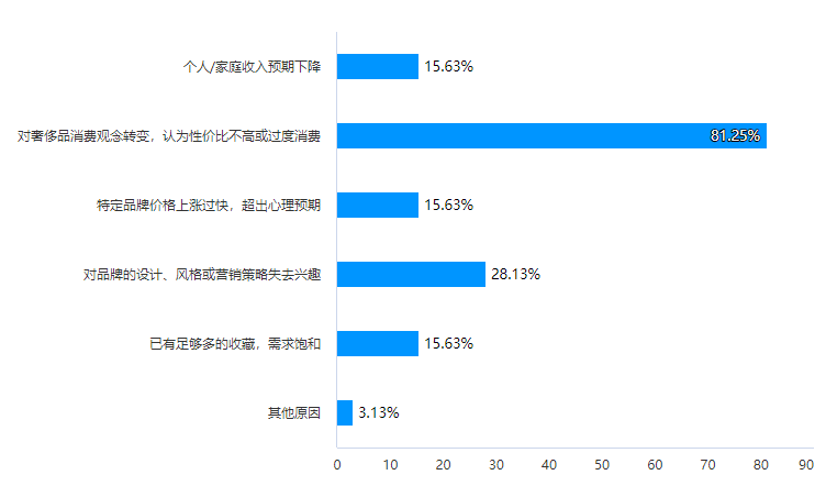 其中,81.25%的消費(fèi)者將原因歸于“對奢侈品消費(fèi)觀念轉(zhuǎn)變,認(rèn)為性價比不高或過度消費(fèi)”;另有15.63%同時反映“品牌價格上漲過快,超過心理預(yù)期”。
